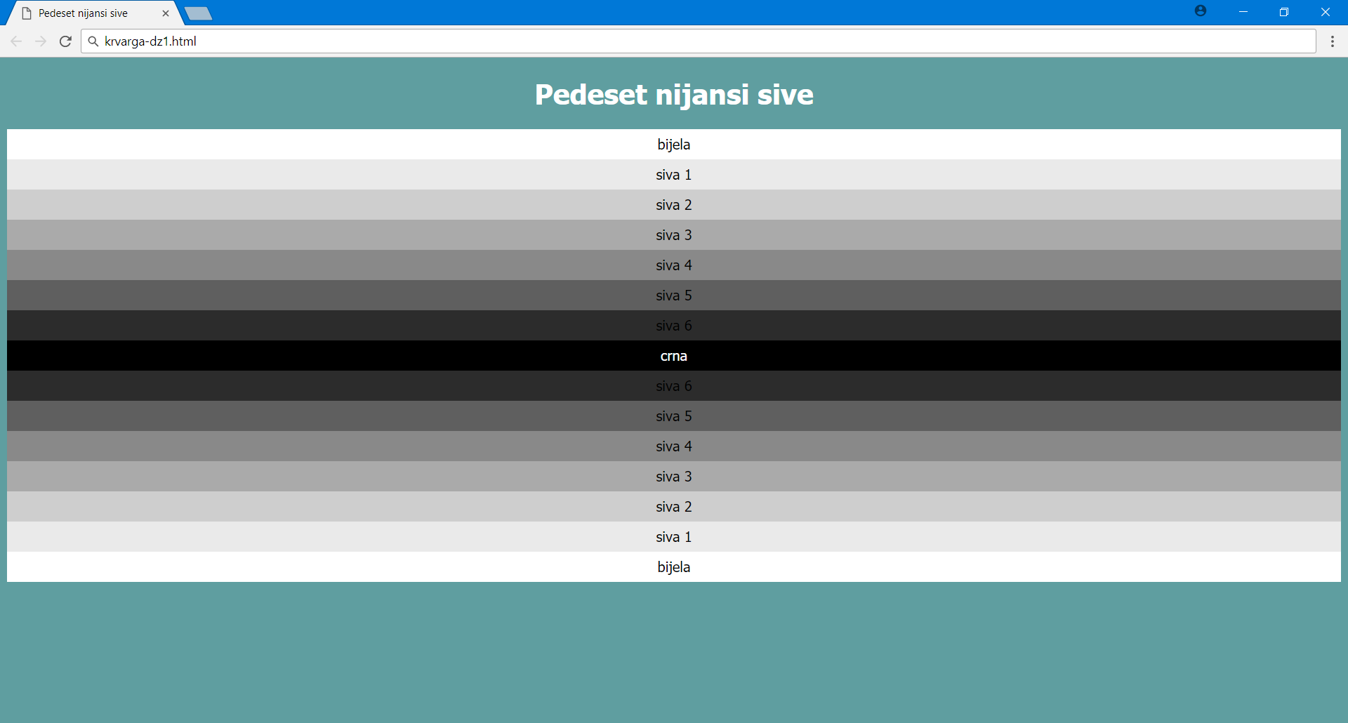 - Izradite stranicu index.html te korištenjem unutarnjeg CSS-a oblikujte skalu sa sivim bojama kao što je objašnjeno na posljednjem nastavnom satu. Naslov neka bude 'Nekoliko nijansi sive'.