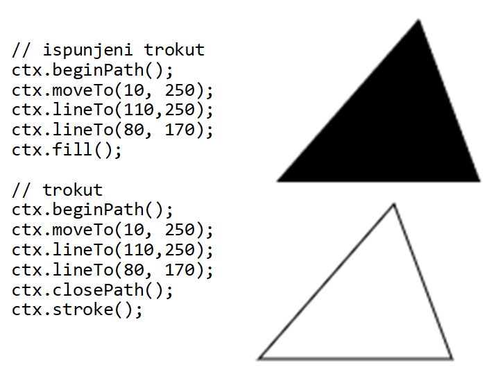 - Pomoću funkcije beginPath() započinje se nova staza, a zatvara funkcijom closePath()