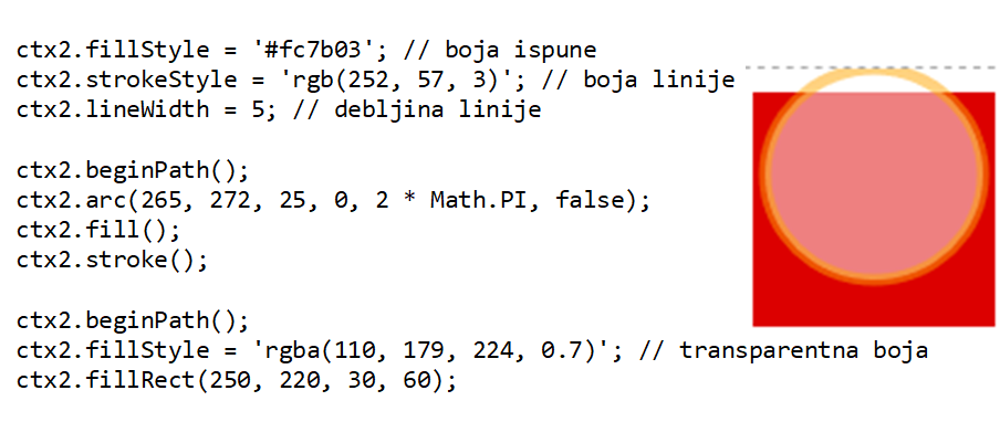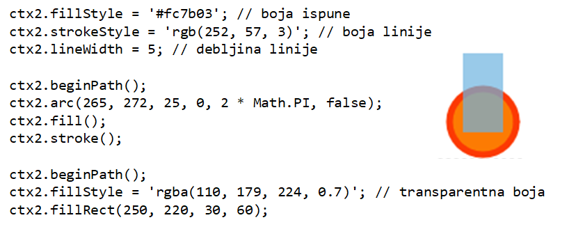 - Canvas omogućava crtanje prozirnih (ili poluprozirnih) oblika i korištenjem svojstva globalAlpha