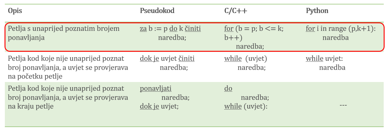 - 3. Petlja s unaprijed poznatim brojem ponavljanja