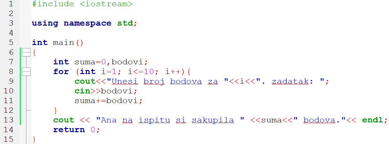 1. primjer: Ana piše ispit koji ima 10 zadataka. Svaki zadatak nosi određeni broj bodova koji piše kraj zadatka. Ana nakon što riješi koji zadatak zapiše broj bodova koji nosi zadatak na papirić koji joj služi za računanje. Planira ih na kraju zbrojiti i saznati koliko je bodova sakupila ukupno. Izradimo joj aplikaciju koja će joj u tome pomoći.