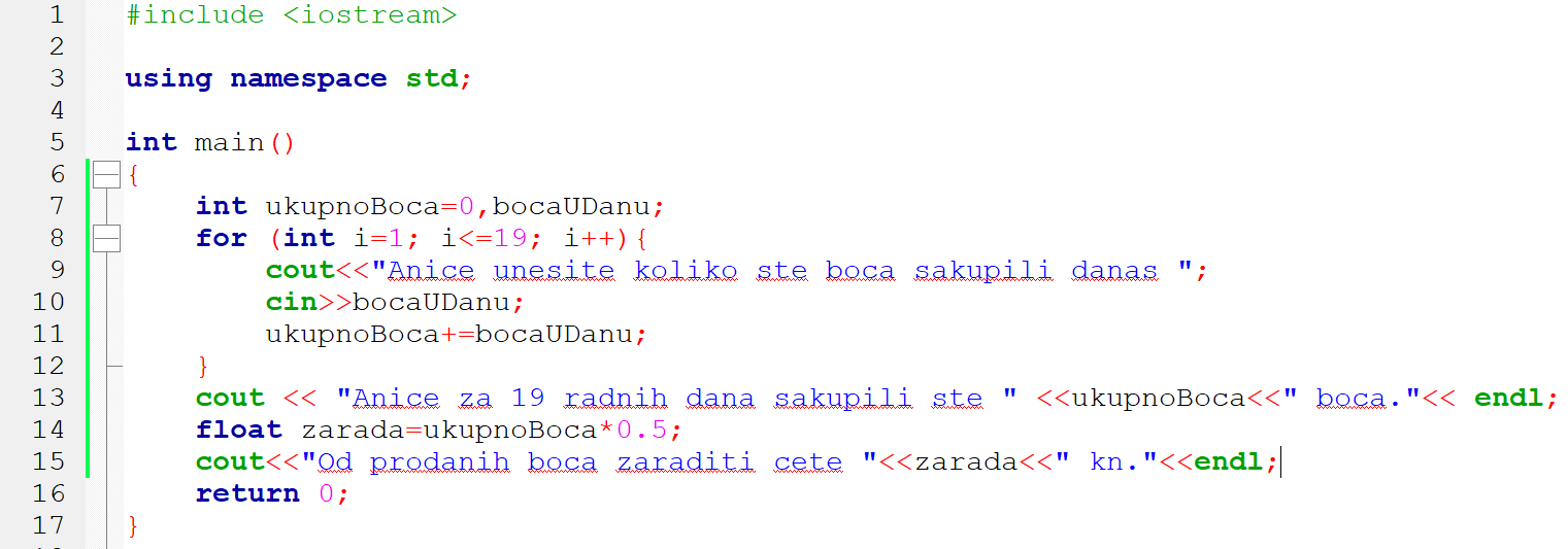 2. primjer: U mjesecu siječnju 2020. je 19 radnih dana. Spremačica Anica u vreću sakuplja PVC boce koje u košarama za otpatke ostave učenici. Na kraju svakog dana izbroji koliko je boca u vreći. Vreće pohranjuje u ostavi za smeće i na kraju mjeseca ih odvozi u obližnju trgovinu na otkup. Izradimo joj aplikaciju koja će joj izračunati koliko će zaraditi prodajom sakupljenih boca ako znamo da svaka boca vrijedi 0.5 kn.