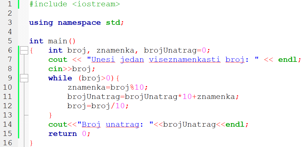 2. primjer: Program koji uneseni broj ispisuje unatrag pomoću while petlje