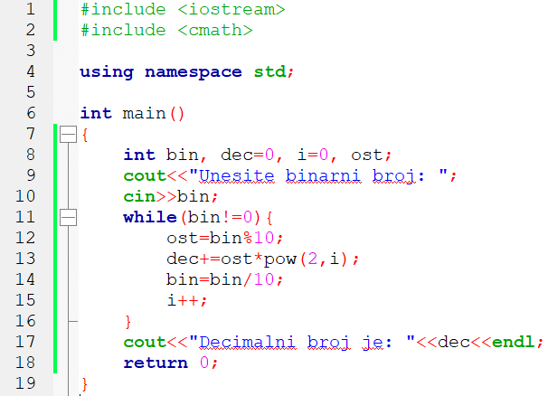5. primjer: Program koji binarni broj pretvara u decimalni.