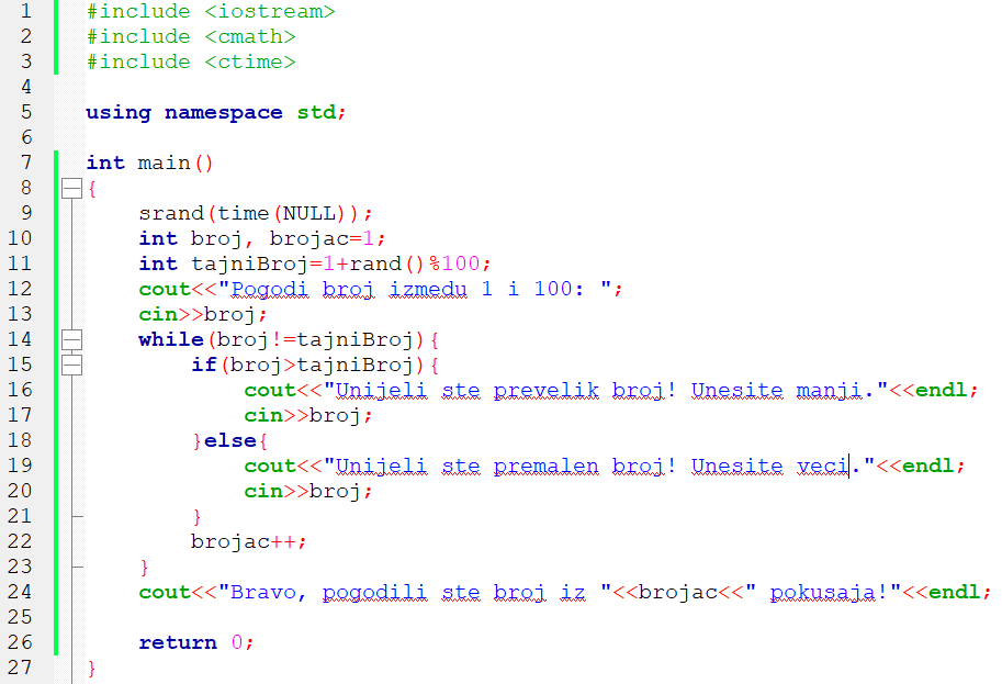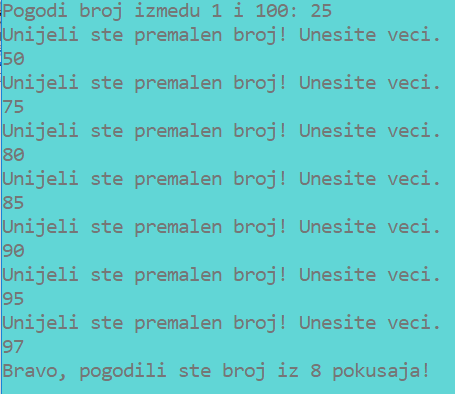 4. primjer: Igra pogađanja gdje korisnik treba pogoditi tajni broj. Nakon svakog pokušaja program korisniku ispisuje poruku je li broj prevelik ili premalen. Na kraju se ispisuje koliko je pokušaja bilo potrebno za pogađanje.
