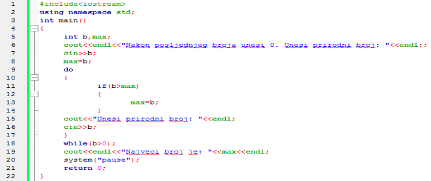 Primjer: Treba unijeti N prirodnih brojeva (N nije unaprijed poznat!) pa pronaći i ispisati najveći uneseni broj. Nakon posljednjeg broja treba unijeti 0.
