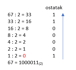 Kako je 67 = 64 + 2 + 1, ispod tih potencija upišemo znamenku 1, a ispod ostalih znamenku 0. I dobili smo naš binarni broj!