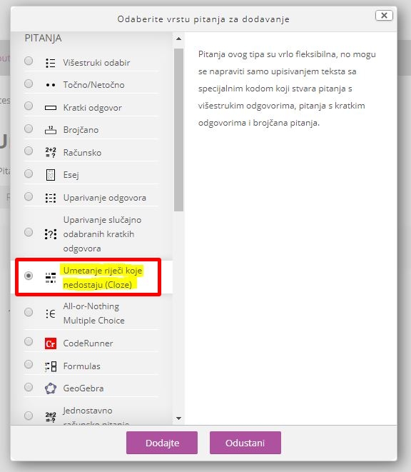 Slika 2. Odabir pitanja u kojem možemo koristiti Cloze Editor